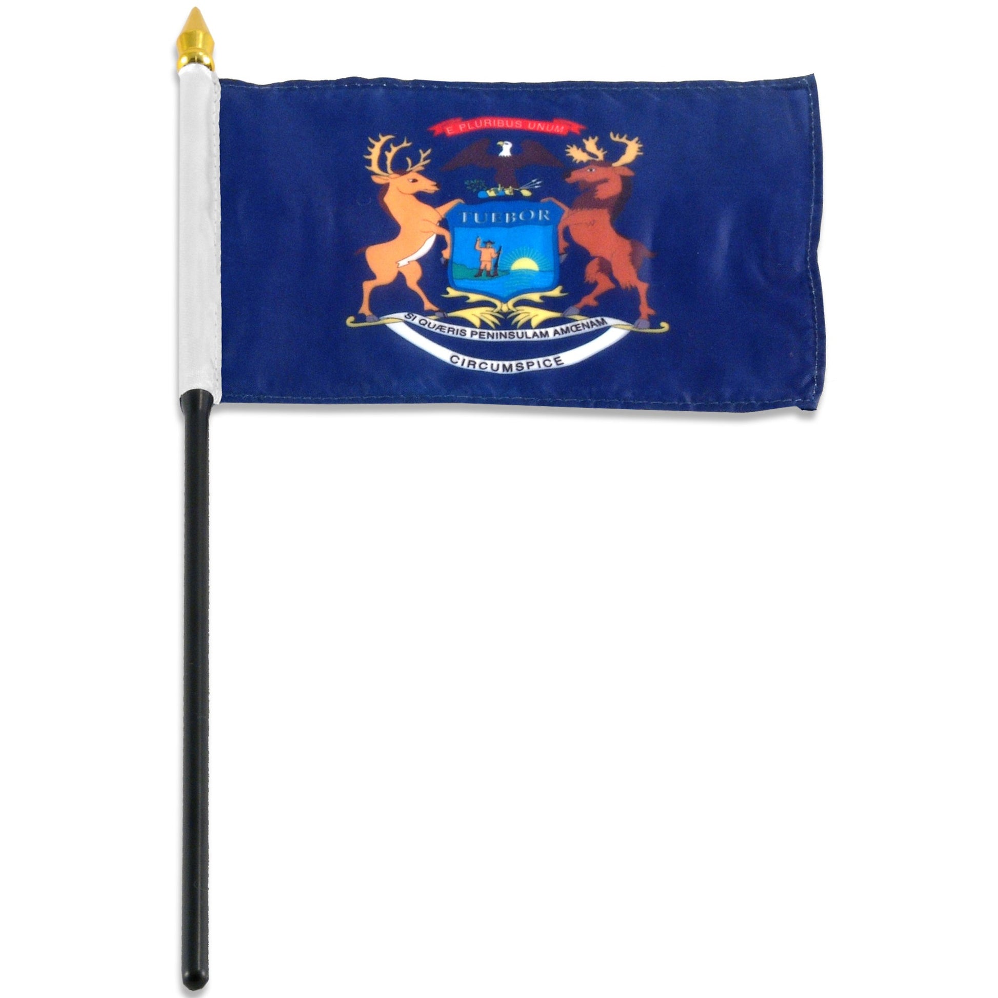 Michigan state stick flag 4 inch x 6 inch, mounted on a 10 inch plastic stick. Flag is made from polyester and printed in bright colors to make an attractive flag. Each flag is individually sewn around the edges.